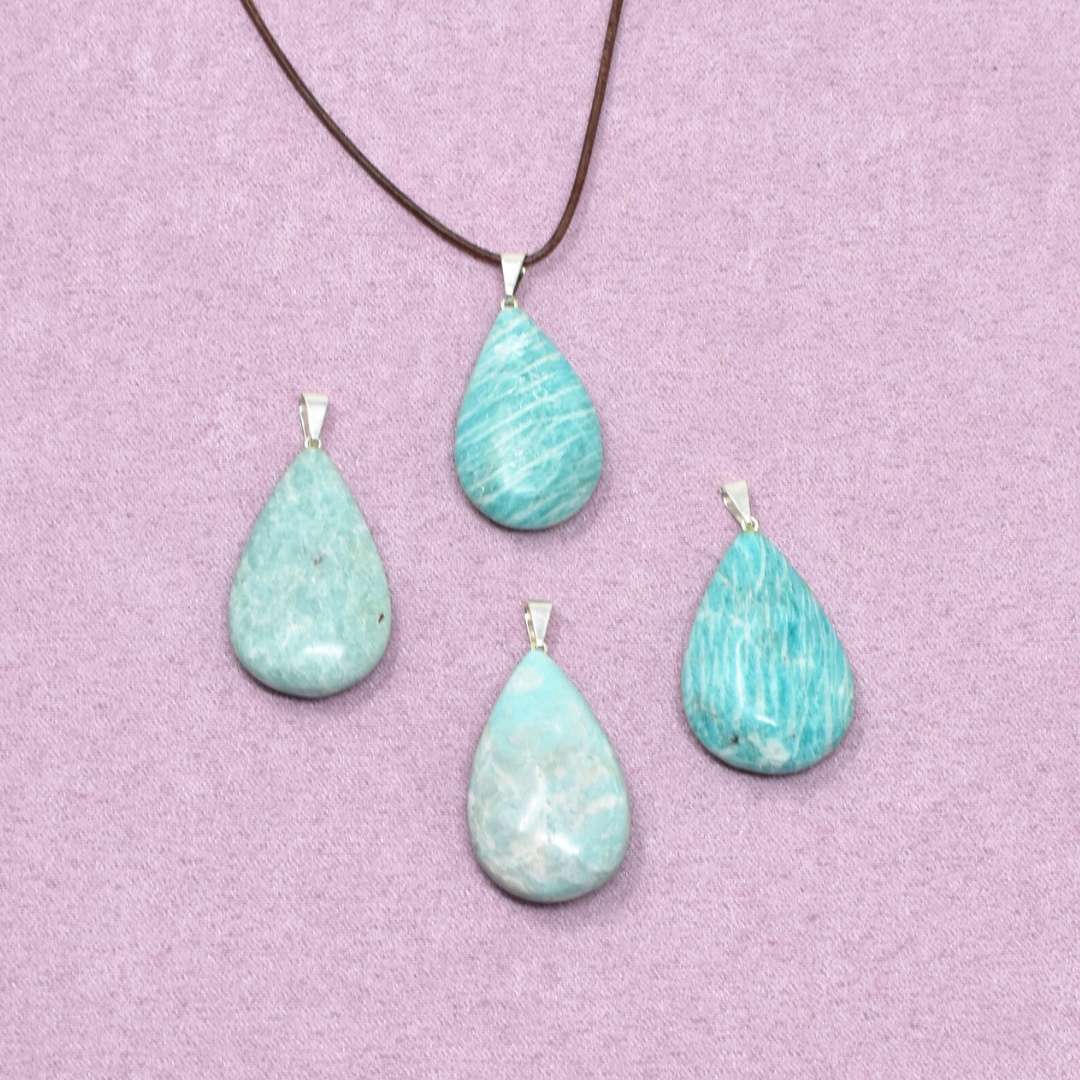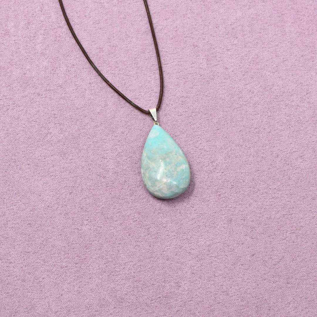 Die Amazonit Halskette mit Tropfen-Anhänger begleitet dich in ruhigere, weichere Momente. Der Tropfen steht für Loslassen, für das Abfließen von Anspannung und für die Erlaubnis, nicht alles festhalten zu müssen.