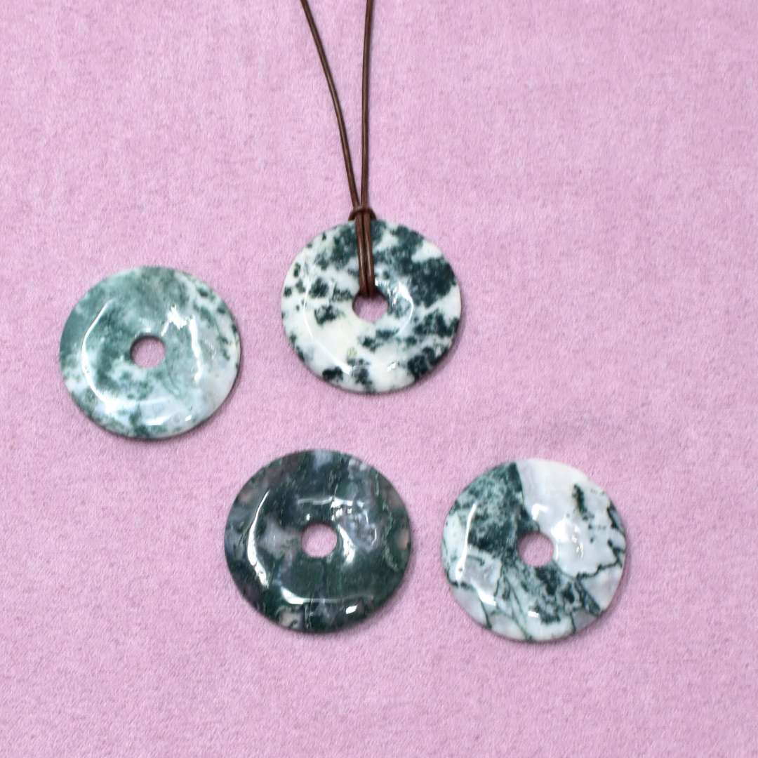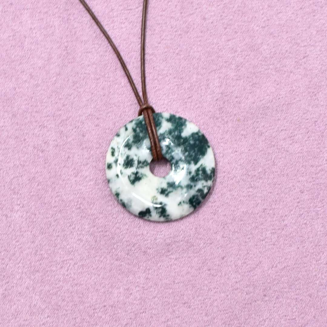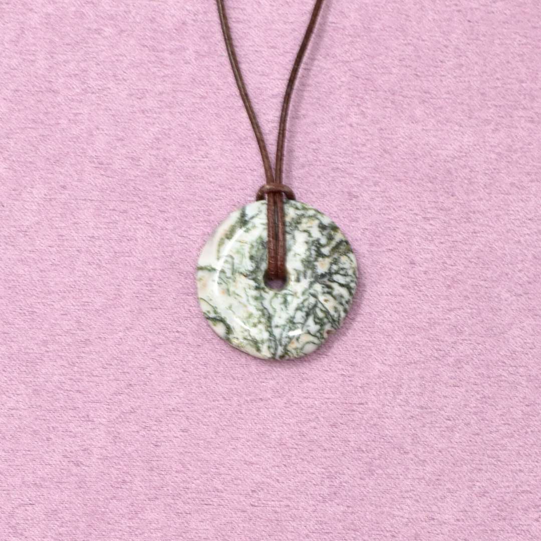 Die Baumachat Halskette mit Donut-Anhänger begleitet dich in Phasen des Übergangs. Der runde Stein steht für Kreisläufe, für Wachstum und für die Erkenntnis, dass Loslassen kein Ende ist, sondern Raum für Neues schafft.