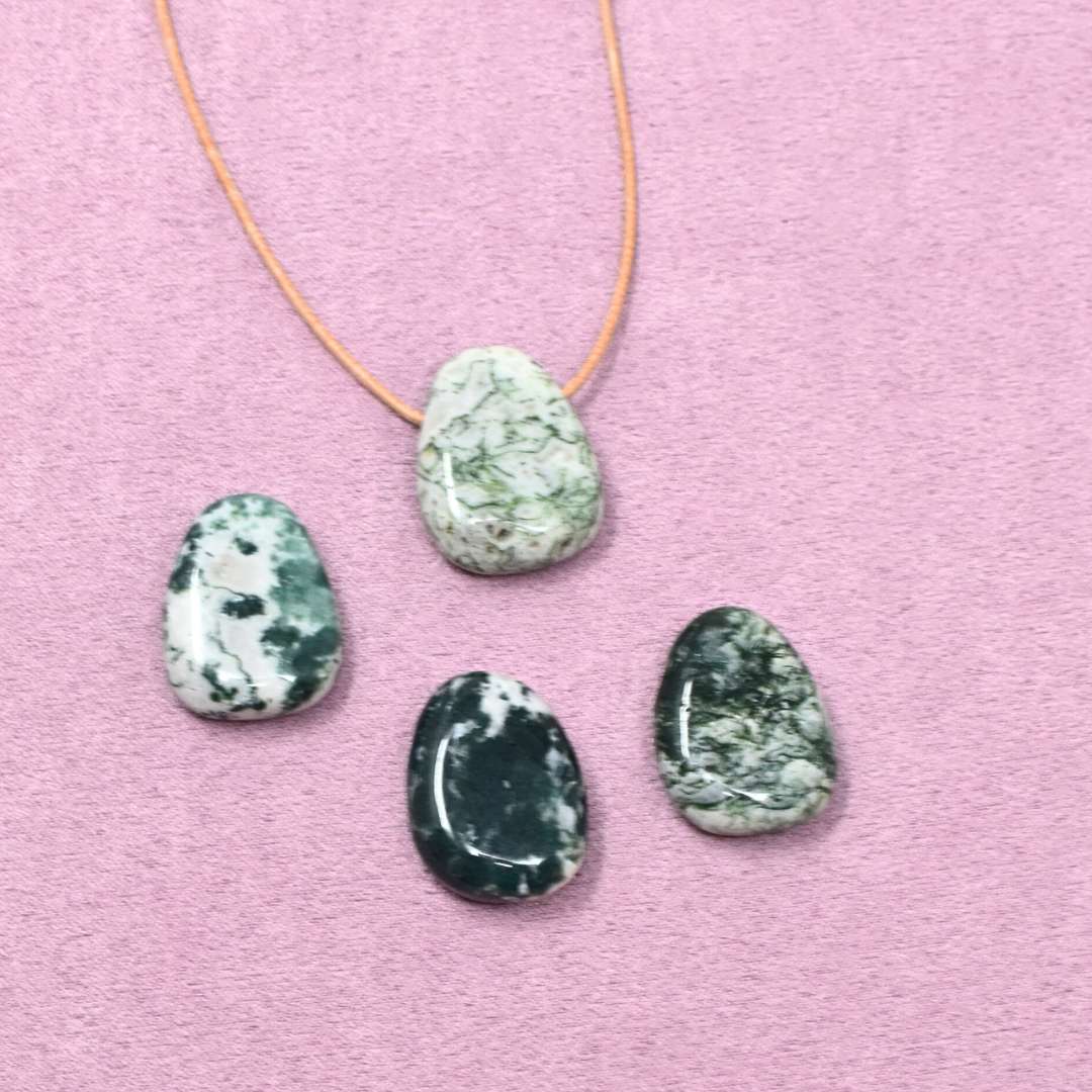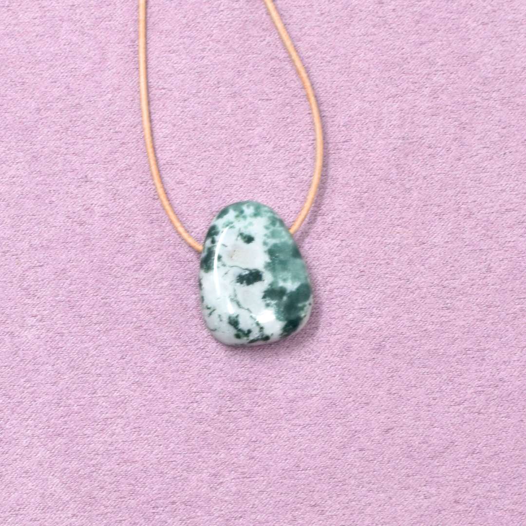 Trage die Baumachat Halskette, wenn du merkst, dass dich etwas fordert. Spüre den Tropfen auf deiner Haut und richte dich innerlich auf.