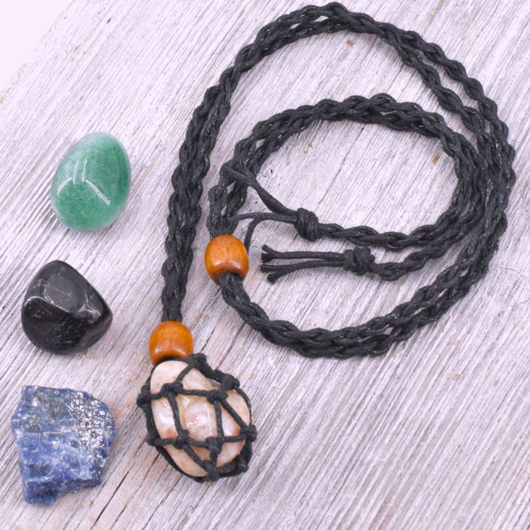 Im geknüpften Baumwollbeutel kannst du deinen Trommelstein jederzeit austauschen. Je nachdem, was dich stärkt, beruhigt, klärt oder einfach gut tut. So wird aus der Kette ein persönlicher Begleiter, der sich mit dir verändert.
