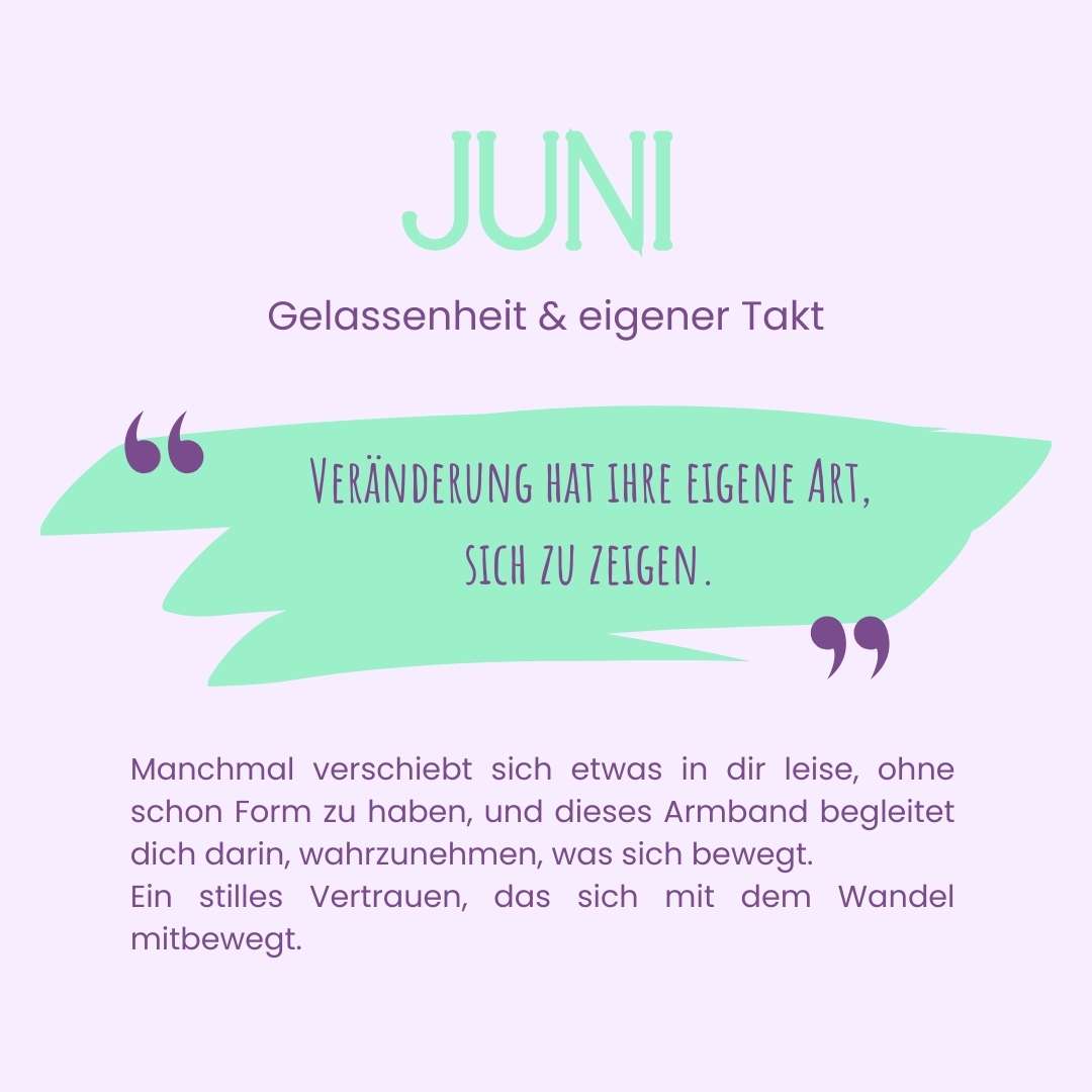 Das Geburtsstein Armband Juni trägt dich durch Phasen, in denen Veränderung nicht laut beginnt, sondern leise. Manches verschiebt sich erst innerlich – in Stimmungen, in feinen Fragen, in dem Gefühl, dass etwas nicht mehr ganz passt. Noch ohne Richtung, noch ohne Worte, aber spürbar anders als zuvor. Und während du versuchst, den Finger darauf zu legen, merkst du: Es ist kein Bruch. Es ist ein Übergang.