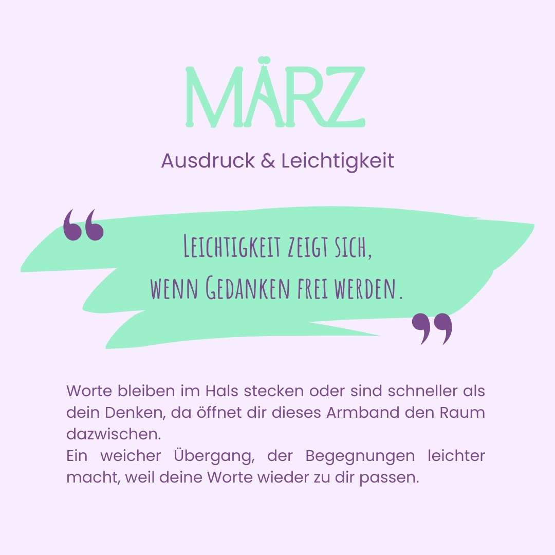 Das Geburtsstein-Armband für den März erinnert dich daran, dass Worte nicht perfekt sein müssen – nur ehrlich. Und dass Klarheit oft dann entsteht, wenn du dir einen kleinen Moment gibst, bevor du sprichst.