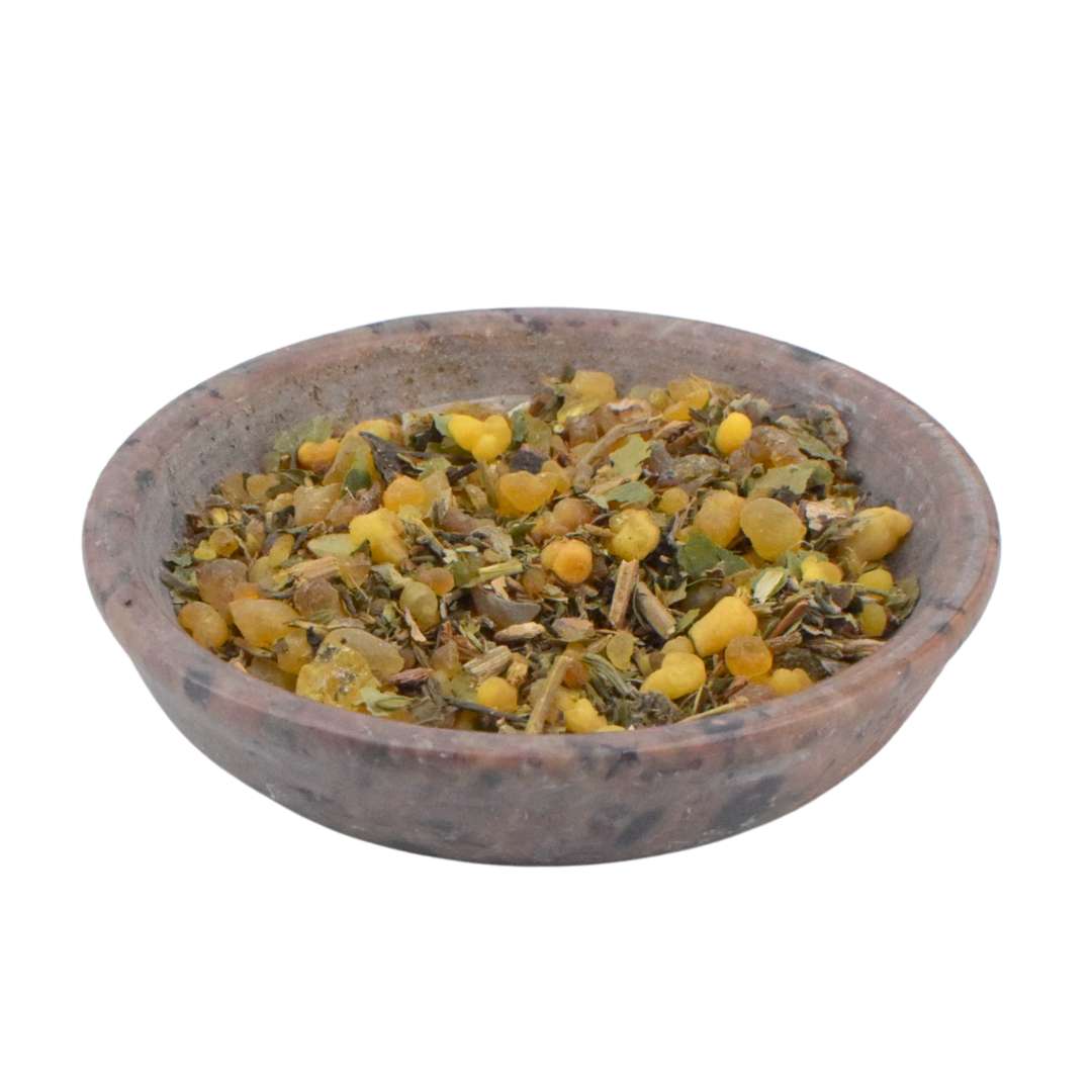 Unsere Räucherwerke entstehen in liebevoller Handarbeit. Die ausgewählten Zutaten werden behutsam gemahlen, gemischt und in einer Klangschale miteinander verbunden.