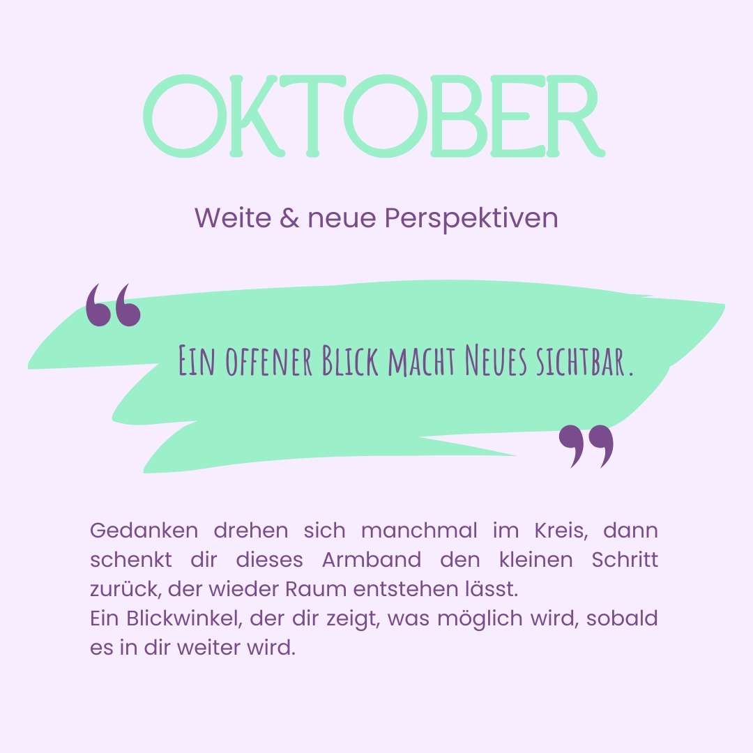 Das Geburtsstein Armband Oktober passt zu Zeiten, in denen du spürst, dass nicht ein neuer Plan fehlt, sondern ein neuer Blick. Manchmal drehen sich Gedanken fest, ohne dass die Situation sich verändert hat. Manchmal wirkt alles unverändert – und doch fühlt es sich an, als würden deine Gedanken immer wieder denselben Pfad gehen, ohne neue Aussicht zu finden. Neues wird oft erst sichtbar, wenn du dich innerlich einen Moment weiter machst.