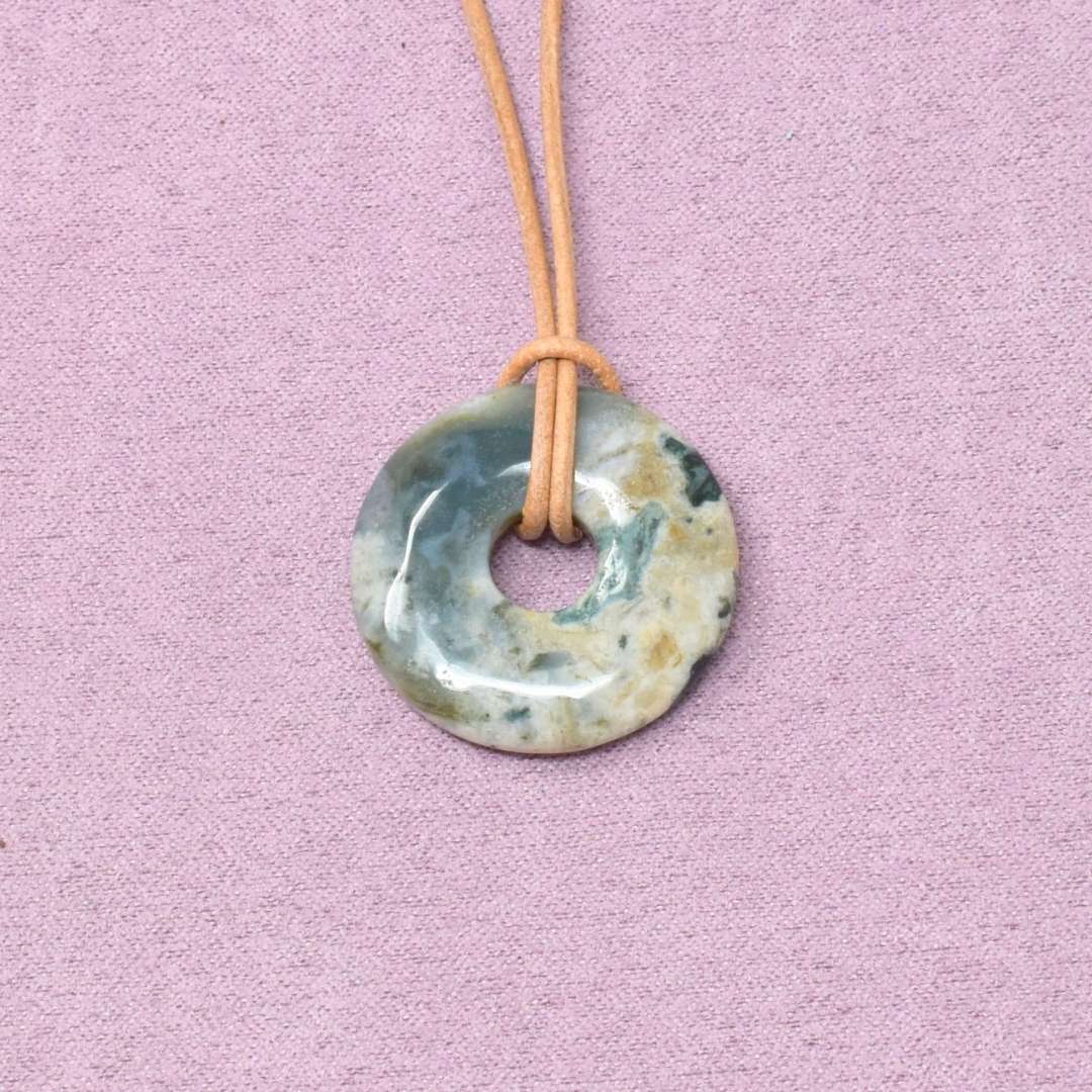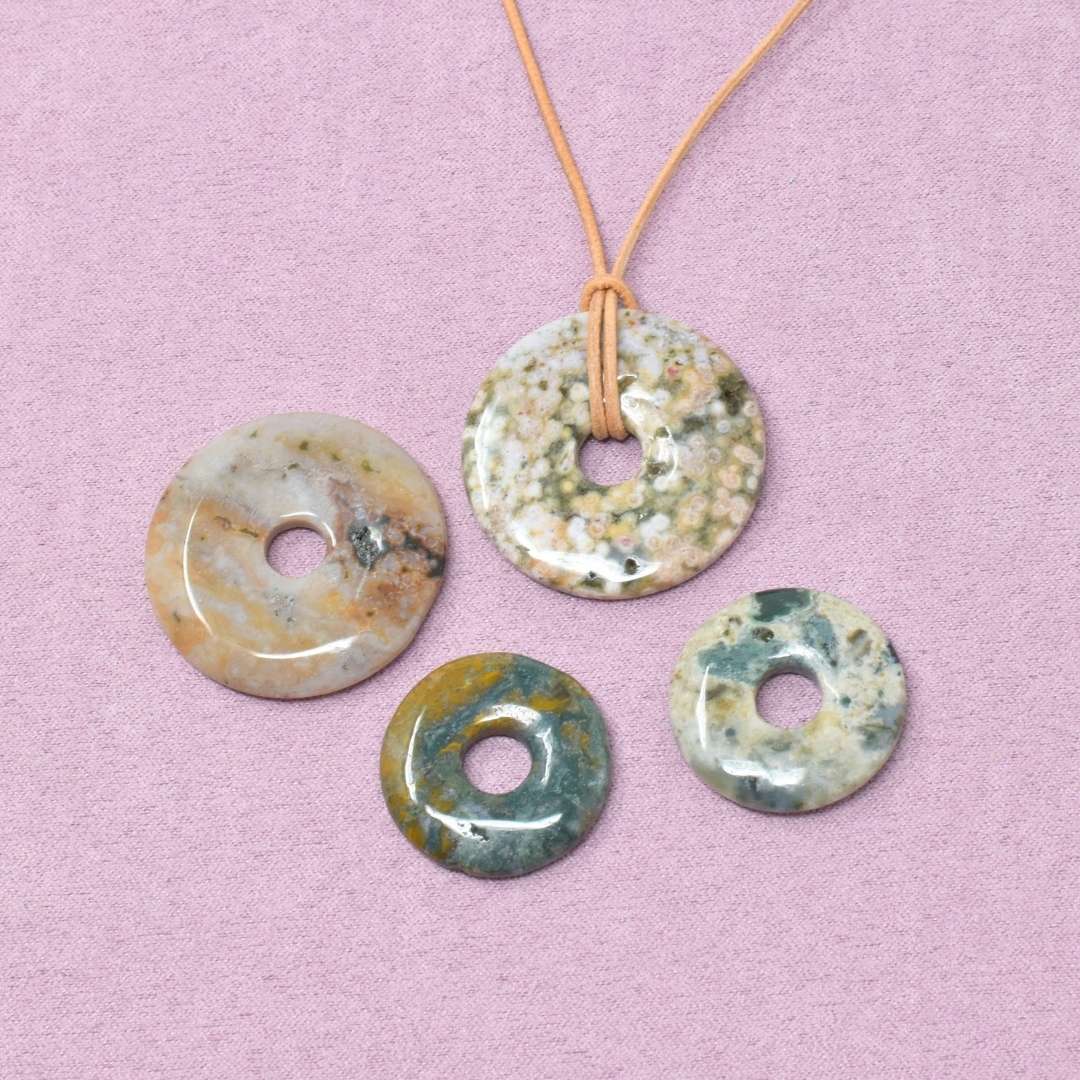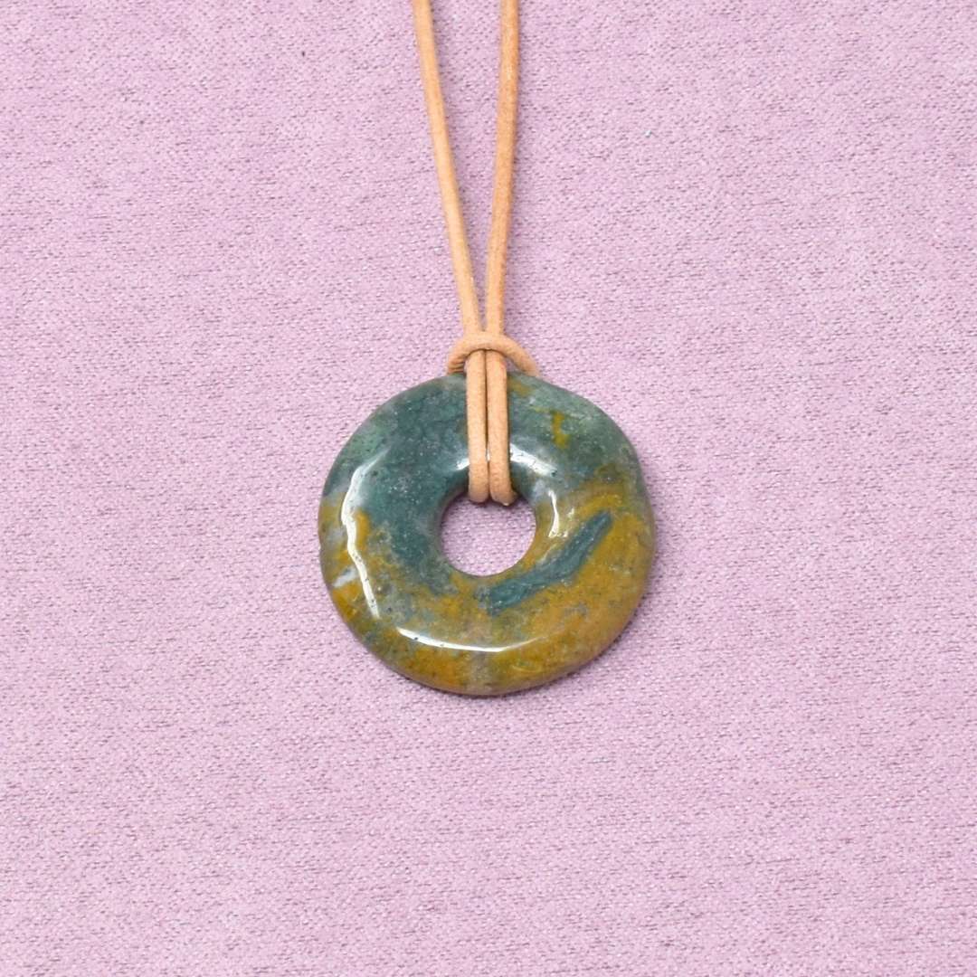 Die Ozean Jaspis Halskette mit Donut-Anhänger begleitet dich in Zeiten, in denen du neue Kraft schöpfen und wieder mehr Fülle und Lebendigkeit in deinem Leben spüren möchtest.